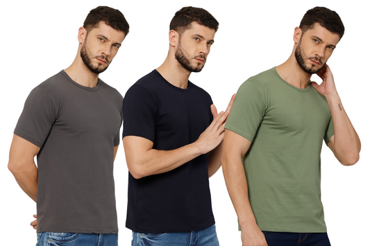 T-Shirt for Men (Grey + Olive Green + Navy Blue) - 100% Cotton Casual T-Shirt | Half Sleeve, Round Neck 4 Way Stretch Fabric
